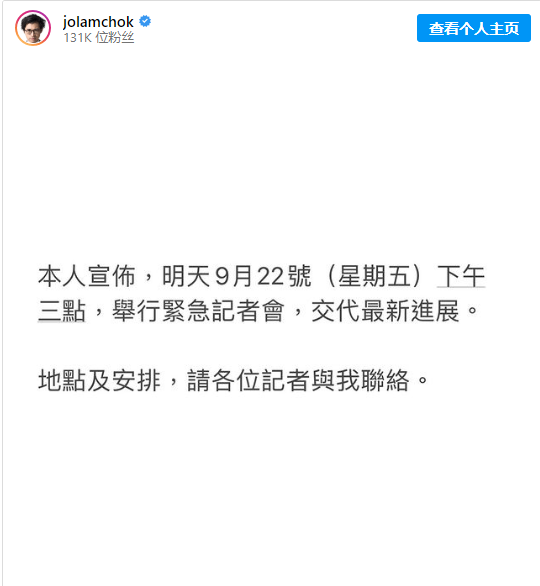 香港新聞網9月22日電 虛擬資產交易平台JPEX懷疑詐騙案,至今共有11人被捕,包括網紅林作等。早先被捕的林作等8名男子已獲准保釋,其中林作繳付30萬元(港幣,下同)保釋金。林作獲准保釋後一直未有開腔回應事件,不過昨晚(21日),林作在社交平台發聲,指會在今日下午召開記者會,交代進展。 昨晚11時許,林作突然在其社交平台Instgram上發布帖文,稱將會在今日下午3時,召開緊急記者會,交代最新進展。