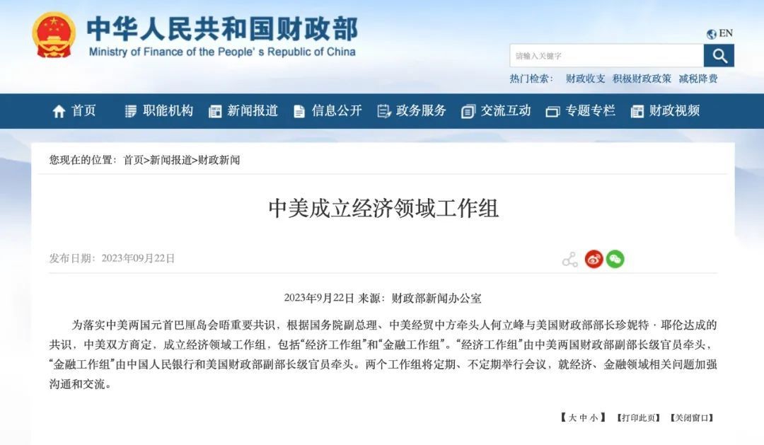 重磅:中美成立經濟領域工作組香港新聞網9月23日電 中國財政部22日晚發佈消息,為落實中美兩國元首巴厘島會晤重要共識,根據國務院副總理、中美經貿中方牽頭人何立峰與美國財政部部長珍妮特·耶倫達成的共識,中美雙方商定,成立經濟領域工作組,包括“經濟工作組”和“金融工作組”。 “經濟工作組”由中美兩國財政部副部長級官員牽頭,“金融工作組”由中國人民銀行和美國財政部副部長級官員牽頭。兩個工作組將定期、不定期舉行會議,就經濟、金融領域相關問題加強溝通和交流。