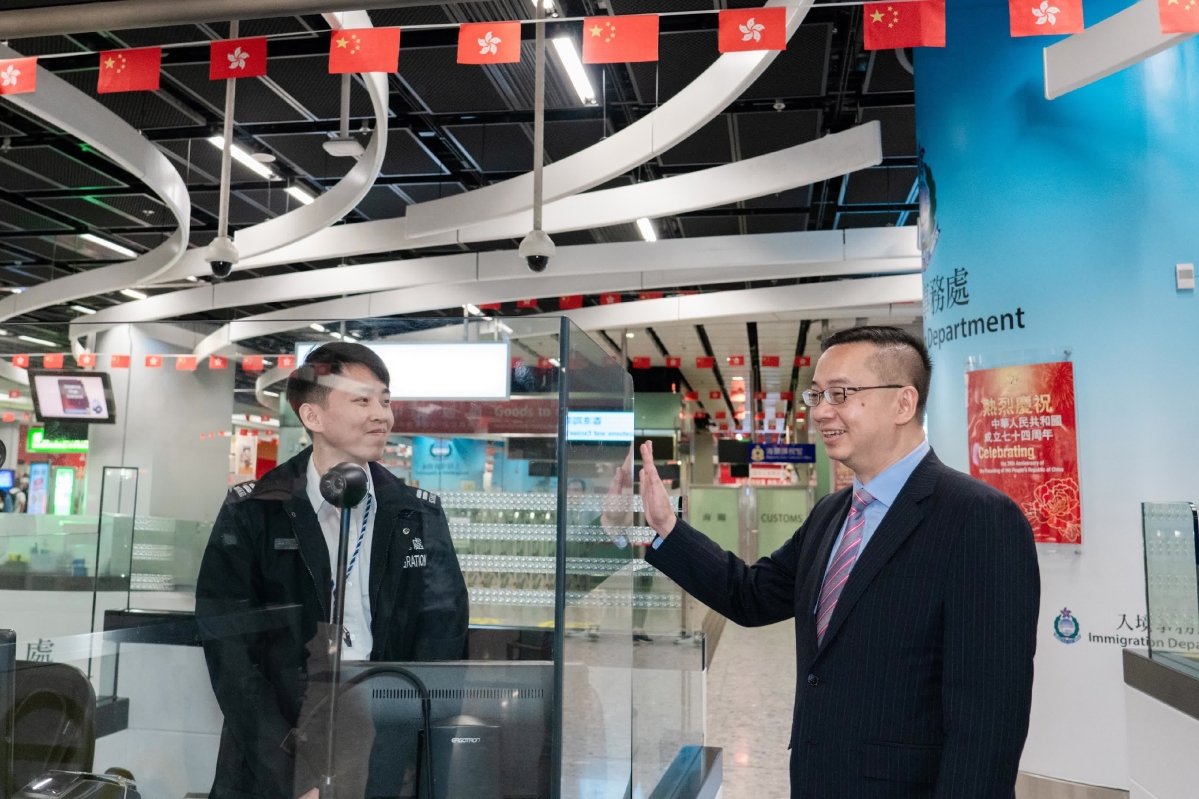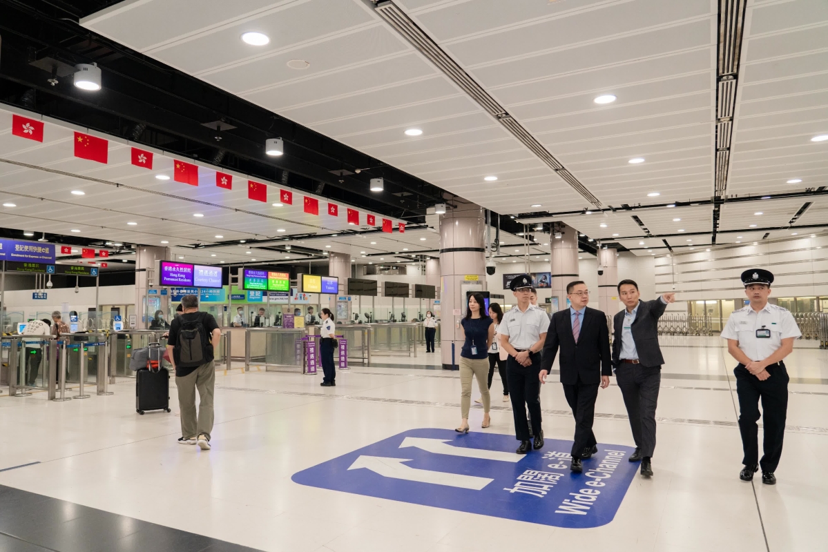 香港特區入境處處長郭俊峯(右)在高鐵西九龍管制站為前線人員打氣。圖自港府新聞處 香港特區入境處估計,假期期間落馬洲支線管制站、羅湖管制站及深圳灣管制站將會非常繁忙,預計分別每日平均約有16.4萬,16.2萬及10.3萬人次出入境。 為疏導假期期間的旅客流量,入境處已減少前線人員休假,以便彈性調配人手,加開檢查櫃枱及通道以疏導人流及車流。同時,入境處亦會增派保安人員協助維持旅客過關秩序。
