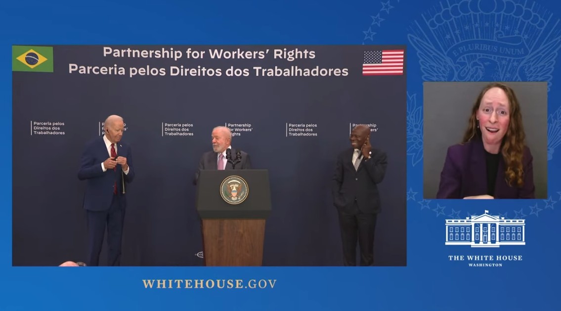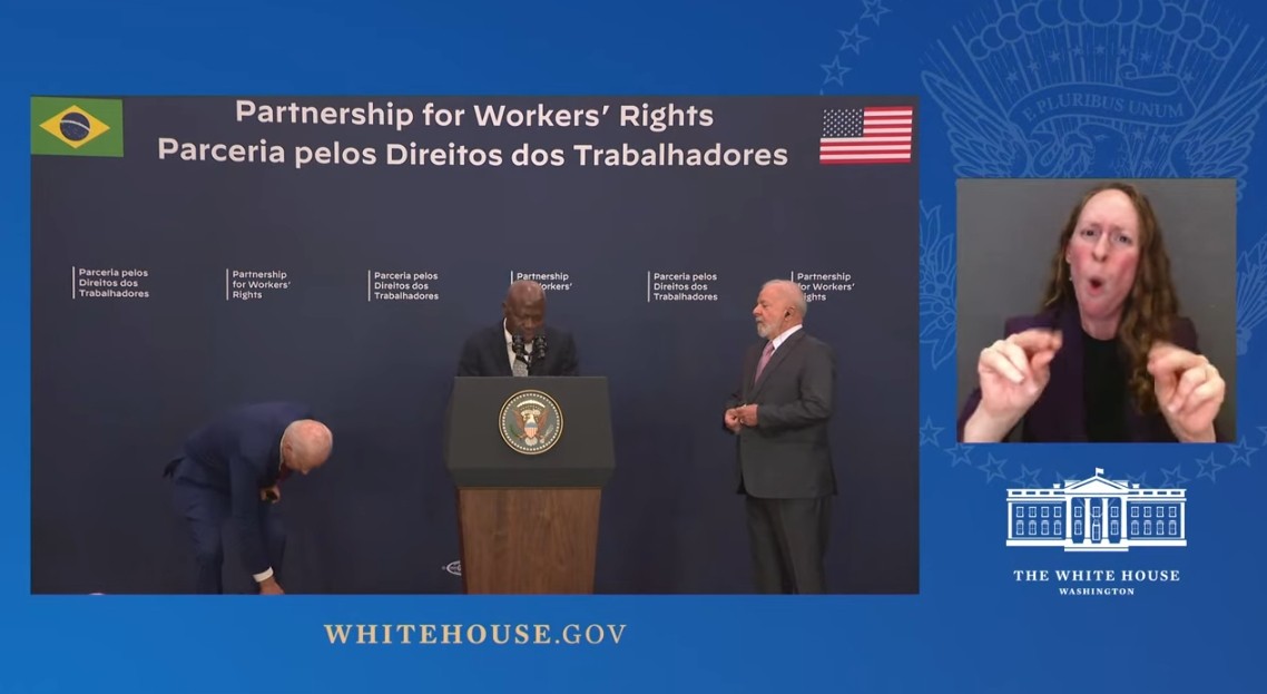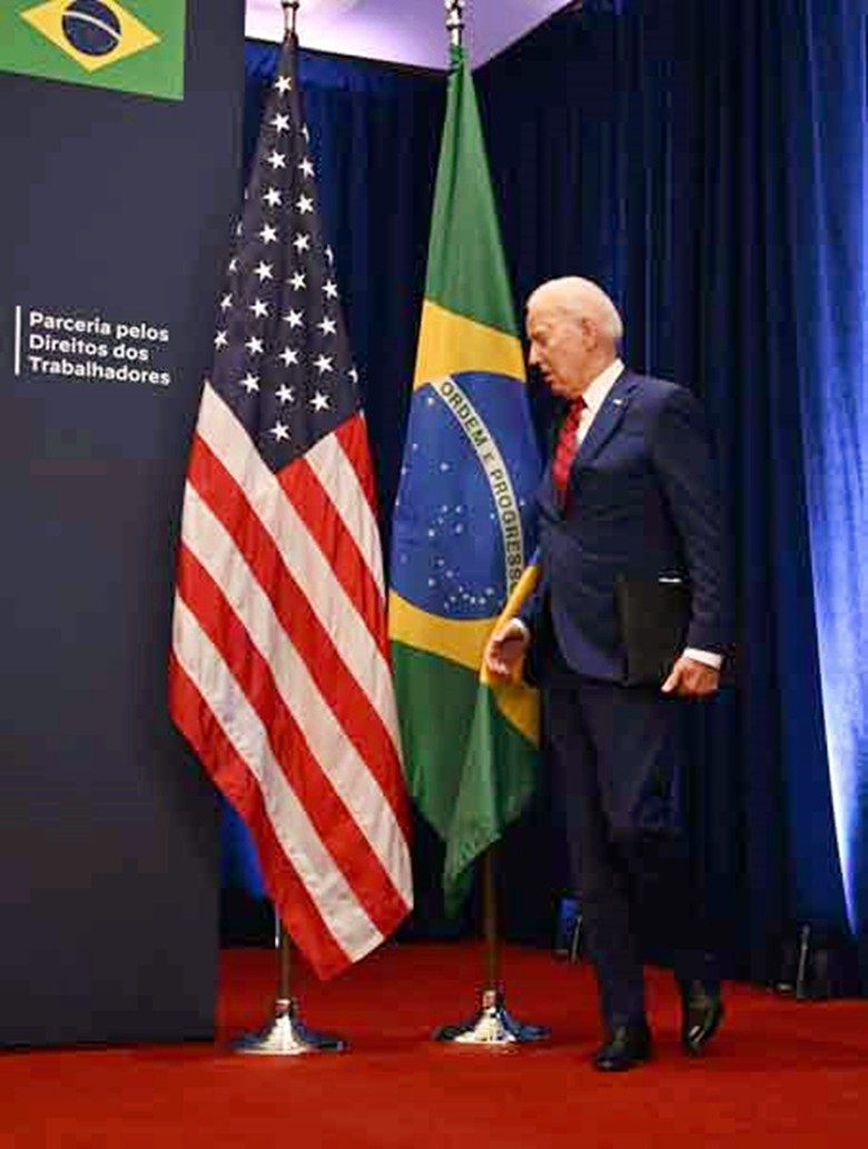 現年已經80歲高齡的美國總統拜登。外媒資料圖 綜合《紐約郵報》、《華盛頓時報》當地時間21日報道,當地時間20日,美國總統拜登、巴西總統盧拉以及國際勞工組織總幹事洪博當天一同出席在紐約舉行的聯合新聞發佈會,美巴兩國宣布啟動勞工權利夥伴關係,共同發起一項致力於維護勞工權利和打擊剝削勞工現象的倡議。 然而英國《鏡報》稱,兩國聯合宣言“出師不利”——拜登拖著腳步出場,一上台就迎面撞上了巴西國旗。