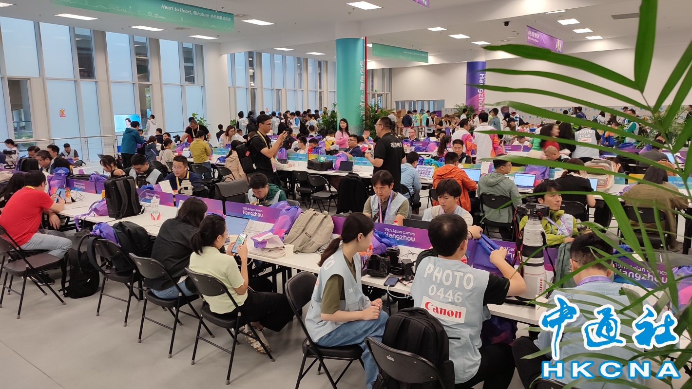 香港中通社記者 洪少葵 攝 杭州亞運會將於9月23日晚正式舉行開幕儀式,但開幕式前,各地區記者早已進入“戰鬥狀態”。今次,共有1.1萬餘名媒體記者注册報名,四年一度的“媒體大戰”再次打響。 每天早上9時,主媒體中心的主新聞中心就開始陸續坐滿記者,劈里啪啦的打字聲大約在晚上10點才會漸息。 現場,一位五官深邃、濃眉絡腮胡、卻身穿綠色李寧短袖的外國記者格外引人注目。他來自沙特阿拉伯奧委會,名叫Albaqous,這是他第二次來到中國。