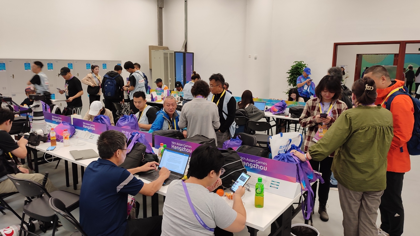 香港新聞網9月23日電(記者 洪少葵)9月23日下午,杭州亞運會開幕式前大批媒體在新聞中心準備就緒。 等待當晚8點亞運開幕式。 大會為記者準備媒體包,裡面有雨衣、食物、水和紀念品。