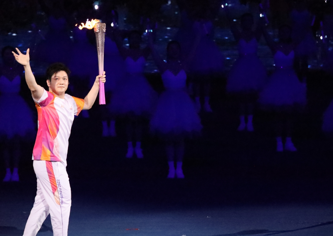 火炬手樊振東向觀眾招手致意