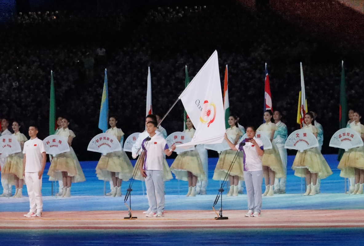 擔任亞奧理事會會旗手的郭晶晶向觀眾招手