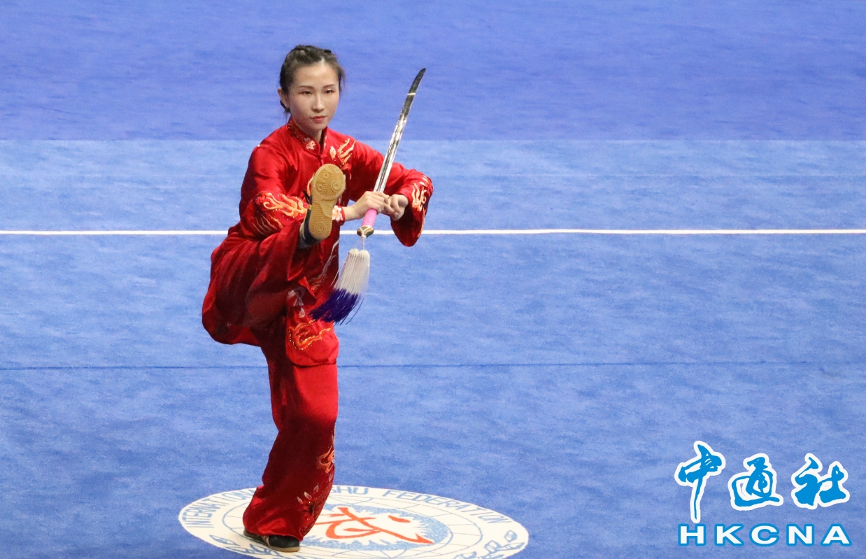 陳穗津。(香港中通社記者 洪少葵 攝) 陳穗津在上午的太極拳項目中以9.746分排名第二,下午太極劍項目中以9.730分排名第四;兩項成績排名位列第三獲銅牌。 賽後陳穗津表示,很開心能獲得獎牌,賽事因疫情延期一年,因此準備了很久。而能跟國家運動員一起站在獎台更加開心。在下午太極劍項目中,她選曲《我和我的祖國》為背景音樂。她指,這是精心準備的曲子,想表達中國香港永遠和國家在一起,也想將中國的傳統文化傳承下去。 在上屆亞運已收獲一枚銀牌的莫宛螢則分別位列第九和第六,無緣獎牌。