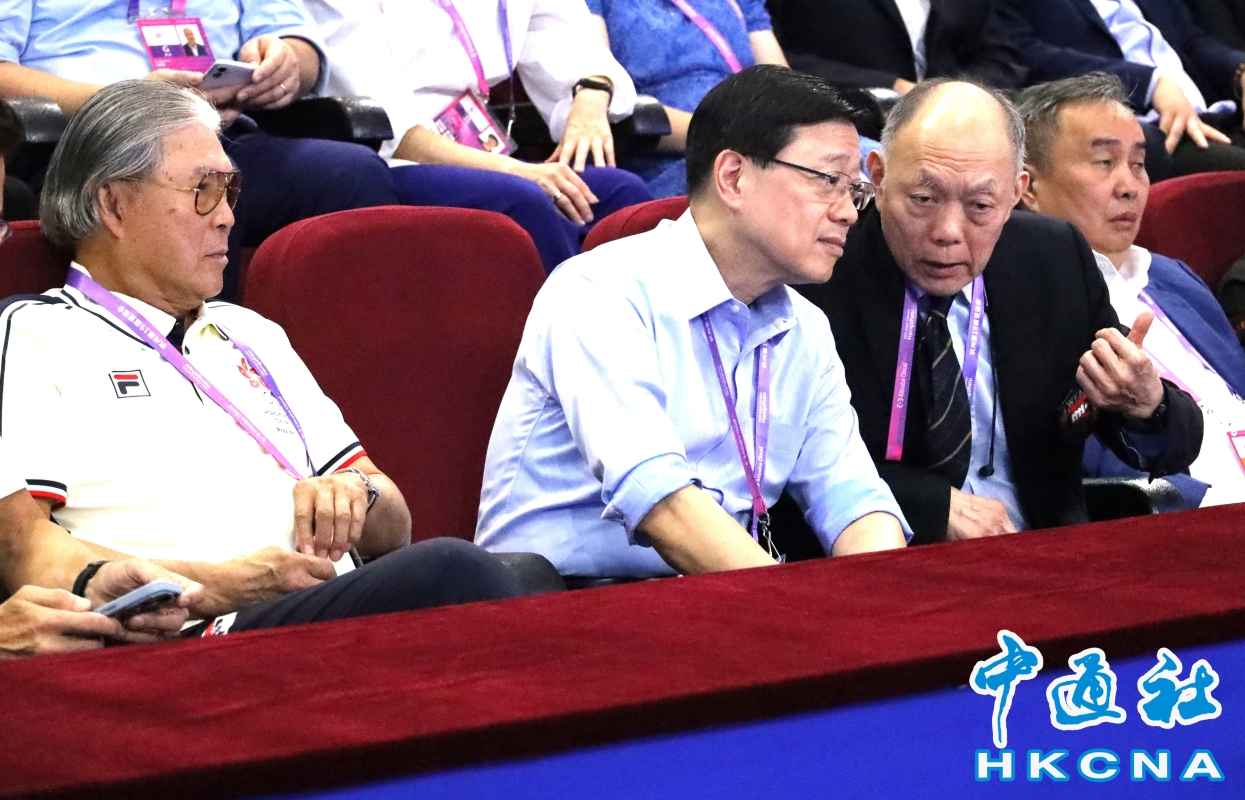 特首李家超和霍震寰交談。(香港中通社記者 洪少葵 攝) 頒獎典禮後的新聞發佈會上,杭州亞運中國香港代表團團長霍啟剛亦到場祝福,並與冠軍國家隊選手童心合影。(完) 【編輯:孟宜君】