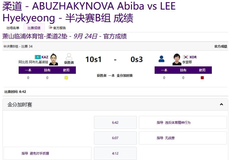 香港新聞網9月25日電 9月24日,杭州亞運會柔道女子48公斤級半決賽在蕭山臨浦體育館舉行。在半決賽B組比賽中,韓國選手掌摑對手被罰下場的一幕,引發網友關注,登上微博熱搜首位。 《北京日報》報道,視頻顯示,韓國選手李慧卿與哈薩克斯坦選手阿比芭·阿布扎基諾娃對決,韓國運動員在比賽中突然用手直接扇到對手哈薩克斯坦選手的臉,造成了對方的不適,裁判立即停止了比賽,隨後以“違反體育精神行為”判定李慧卿犯規。 哈薩克斯坦選手由此直接晉級決賽,最終獲得銀牌,金牌被日本選手角田夏實摘得。