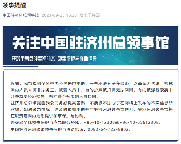 香港新聞網9月26日電 微信公眾號“中國駐濟州總領事館”9月25日發佈領事提醒稱,近期,中國駐濟州總領事館接到多名中國公民來電求助,一些不法分子在網絡上以高薪為誘餌,招攬國內人員來濟非法務工。被騙人員中,有的護照被扣押無法回國,有的被強行索要中介費蒙受經濟損失,有的甚至被限制人身自由。