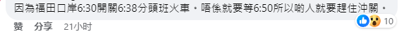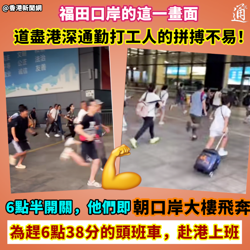 (香港新聞網製圖) 有關視頻隨即於香港網絡流傳,各種議論紛至沓來。 “完全是(香港)工展會、書展翻版。”就人群跑步衝入口岸大樓的畫面,有網友直指具“港式特色”,認為香港人做什麼都“唯恐落於人後”。 不過有網友就作出解釋,指這是因為福田口岸早上6點半開關,頭班列車會於6點38分開出。若等候人士趕不及,便只能等待下一趟6點50分開出的列車。為能準時“返工(上班)”,才有了跑步過關之舉。 “周末過深圳吃喝玩樂的朋友感受不到,我們每日兩地往返打工人的這種氣氛。”留言區內,有部分兩地通勤的打工人笑言,“每天一早上班跑一跑、跳一跳,朝氣滿滿,冬天還可以保暖。” 不少網友亦被他們樂觀的情緒感染,為他們加油打氣,形容港深通勤的打工人是“為生活和未來奔跑的人”。