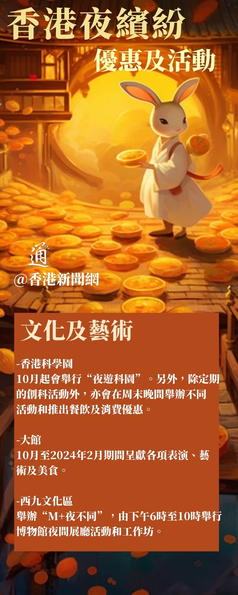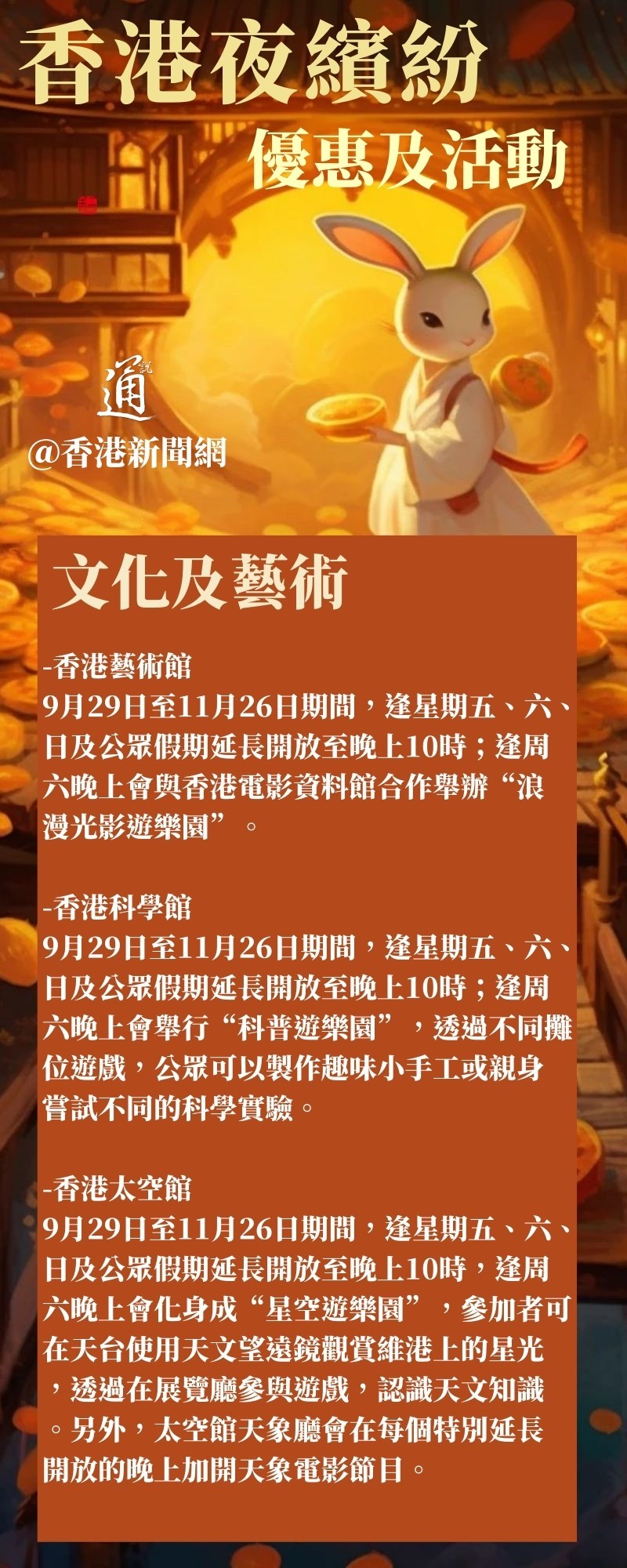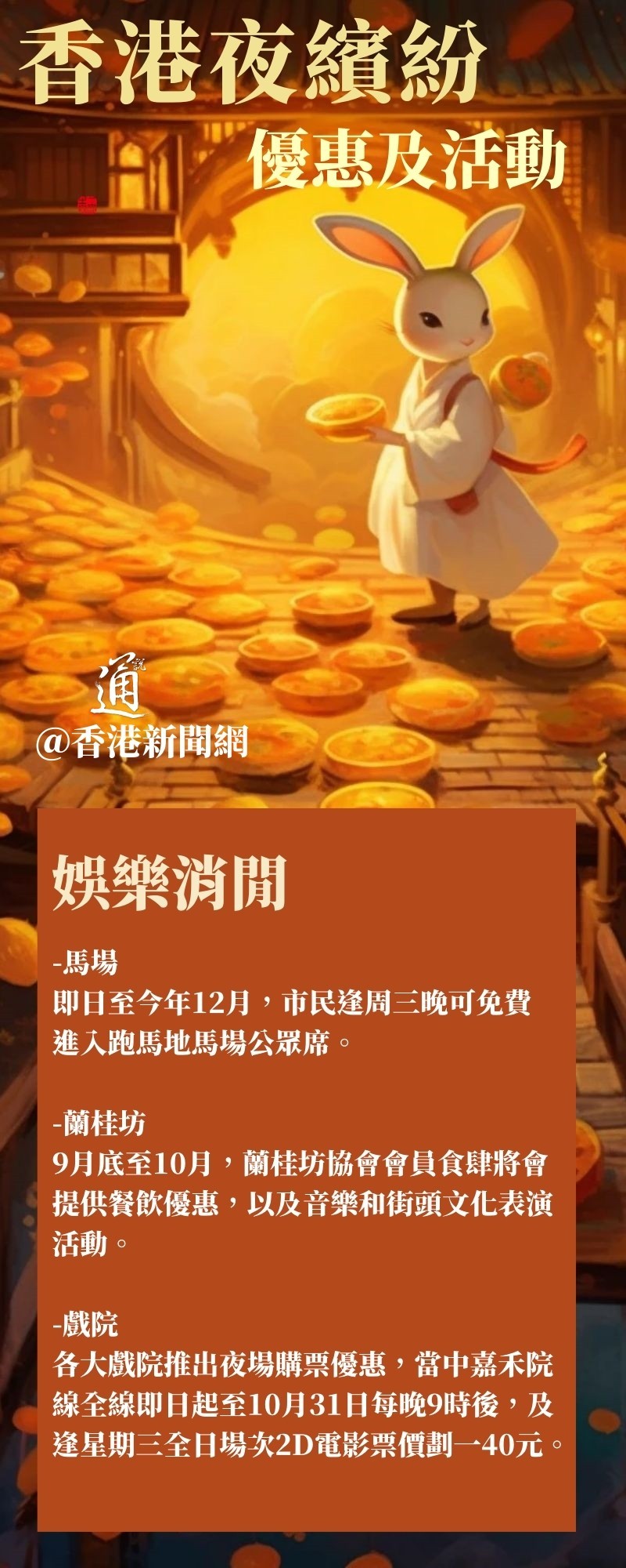 當然,為了讓大家開心過節,香港特區政府更是適時推出系列福利,包括10月1日免費搭乘輕鐵、港鐵巴士、電車、天星小輪,過千家餐廳推出指定菜式和餐飲品的折扣優惠,全港逾60家商業戲院的戲票將以半價發售,康文署下轄的多項康樂文化設施可供免費使用等。特區政府近月一直推動“夜經濟”,中秋國慶這樣的好機會又怎會錯過?一系列“越夜越繽紛”的活動陸續推出,你可以漫步在維港邊,聽著耳熟能詳的經典電影歌曲,漫步香港電影拍攝名場面。也可以舉著小酒杯,在維港的微風中,盡享國際級美酒。這個長假,到香港來吧!有風,有酒,有歌,有風景。