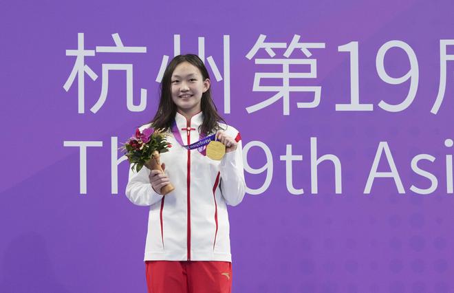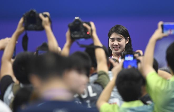 9月29日,中國選手張雨霏在賽後留影。當日,杭州亞運會游泳項目比賽全部進行完畢。新華社 新華社報道,女子50米蝶泳比賽中,依舊發著低燒的“蝶後”張雨霏出發後一路領先,率先以25秒10破賽會紀錄的成績觸壁,奪得她在本屆亞運會的第六金,隊友餘依婷以0.61秒之差摘銀,上屆亞運會該項目冠軍、日本選手池江璃花子收穫一枚銅牌。 “從大運會到亞運會,教練都說從沒見我這麼自律過,之前如果說覃海洋訓練能打100分,我的訓練只能打80分。這段時間我可以給自己打97、98分,證明付出是有回報的。”張雨霏說,“給自己的亞運會打95分,扣分項就是從事這麼多年游泳以來,從沒在比賽期間生過病,這是職業運動員不允許出現的。”