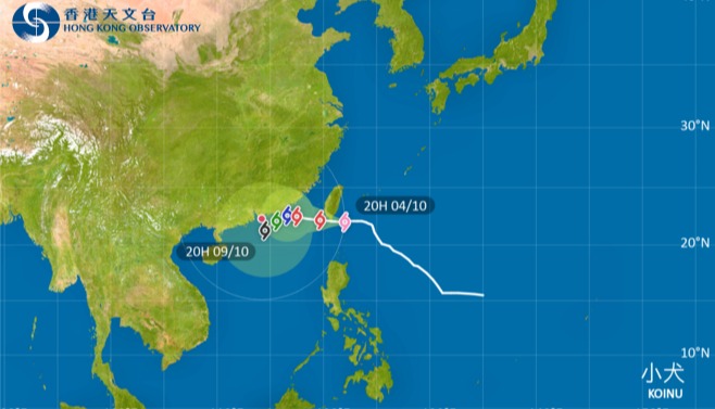 香港中通社9月30日電 9月30日,熱帶氣旋“小犬”在西北太平洋生成,現集結在菲律賓馬尼拉以東約1160公里。據香港天文台熱帶氣旋路徑圖顯示,“小犬”下周初至中期移向呂宋至台灣一帶,並於下周四(10月5日)增強為強颱風,闖入香港800公里範圍,惟受東北季候風影響,“小犬”隨後的路徑及強度存在變數。