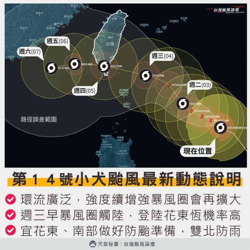 香港新聞網10月3日電 今年第14號颱風“小犬”已升級為中度颱風,並在逐步增強。預估將於明天(4日)至後天(5日)正面登陸台灣台東或恆春半島。小犬颱風除可能正面吹襲台灣外,也對福建、廣東沿海構成威脅。福建今晨(3日)發布防颱4級應急響應,廣州市要求相關單位保持高度戒備,做好防颱準備。