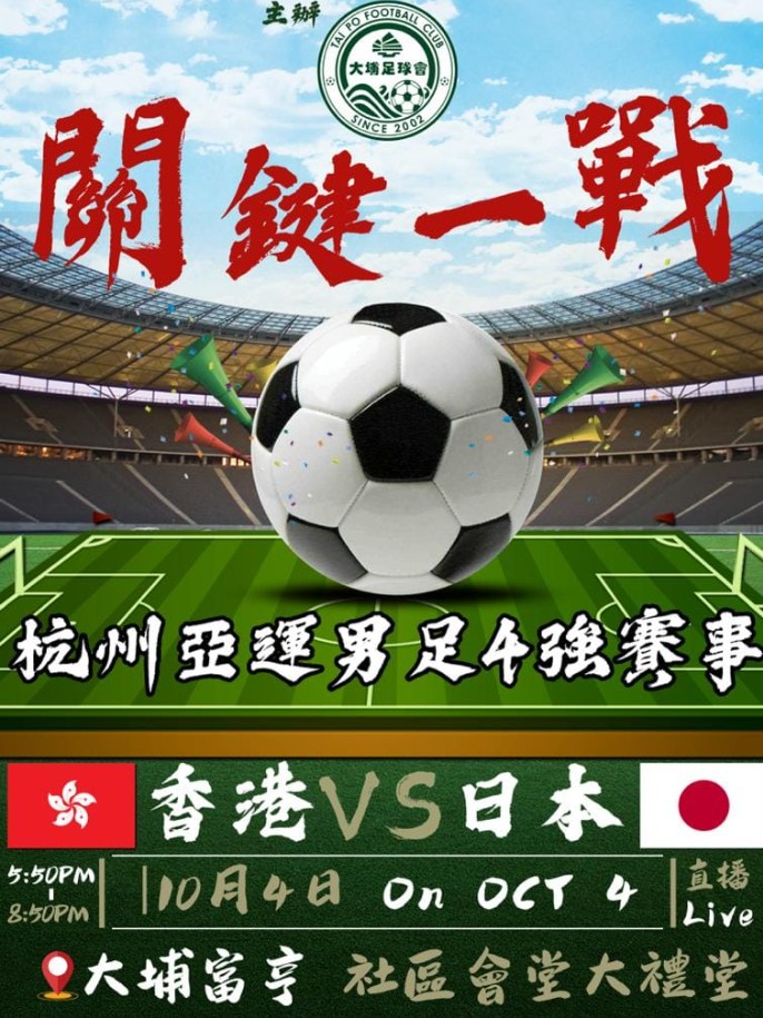香港足球代表隊歷史性打入杭州亞運男足4強,今晚(4日)6時大戰日本隊爭入決賽。(圖片:香港足總Facebook) 香港vs.日本 HOY TV 77台今晚6時直播 港足今屆晉級過程既具戲劇性兼展示拚勁,在分組賽對手敘利亞和阿富汗隊退賽而提早晉級,16強及8強均1球擊敗巴勒斯坦及伊朗隊,首闖4強賽後隨即網上“洗版”。連同周六的決賽或銅牌戰,意味還有兩仗,16強領紅的翼鋒簡嘉亨,早前返港為港會戰畢高級組銀牌首圈後,本月2日再赴杭州會合大軍。香港足球總會今晚在比賽時間於銅鑼灣一間戲院舉行觀看球賽活動,該戲院網站購票每張象徵式收費1港元,一開賣瞬即售罄;大埔富亨社區會堂大禮堂同一時間亦有辦免費睇波活動,而奧海城等全港39個商場屆時都會直播賽事。