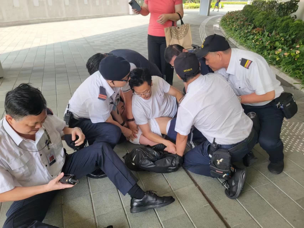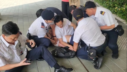 保安員與途人合力制服少年。圖源:點新聞 事發在今天(4日)早上10時許,一名手持利刀的少年突然向政府總部保安員施襲,其中一名保安手部被鎅傷,另一人腳部扭傷。保安員隨後與途人合力將少年制服,按倒在地。現場遺下一把生果刀、黑色背囊及保溫瓶。
