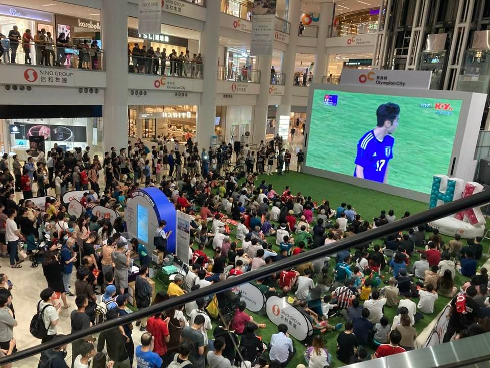 (香港中通社記者 謝光磊 攝) 立法會議員鄭泳舜及足總副主席、前民政事務局局長徐英偉亦有到場支持。 球迷在觀看期間不停高呼口號,為港隊吶喊打氣,亦有球迷高呼港隊球員名字,現場氣氛熱熾。 而香港、九龍、新界共計有39間商場,亦直播全場賽事。其中在奧海城,有430吋大電視直播賽事,大批市民在草地位置觀看,有人手舉“齊撐港隊”的手幅,並高呼“港隊加油”。 有港迷表示,港隊與日本隊實力懸殊,但認為港隊能夠進入四強已經十分出色,今場比賽只要“搏盡無悔”便夠。亦有市民指,港隊表現已發揮得很好,會繼續為他們打氣。