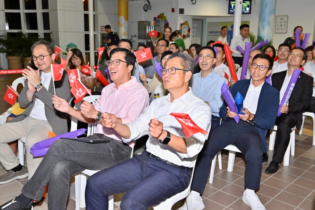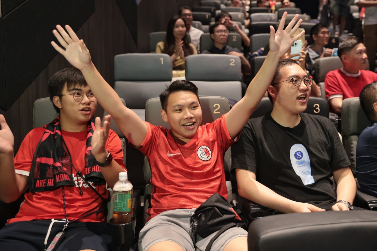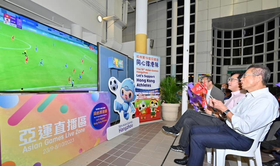 (網圖) 除此之外,為了支持大埔球員謝家榮和Alex JoJo,大埔足球會宣佈在大埔富亨社區會堂大禮堂舉辦球賽觀看活動,邀請球迷們一同參與。而康文署亦在18區轄下的指定體育館設立“亞運直播區”播放亞運賽事。 多名司局長亦有前往直播區觀看,包括財政司司長陳茂波、財政司副司長黃偉綸、文化體育及旅遊局局長楊潤雄、房屋局局長何永賢及康文署署長劉明光等。他們手持區旗及加油棒,落力為港隊打氣。
