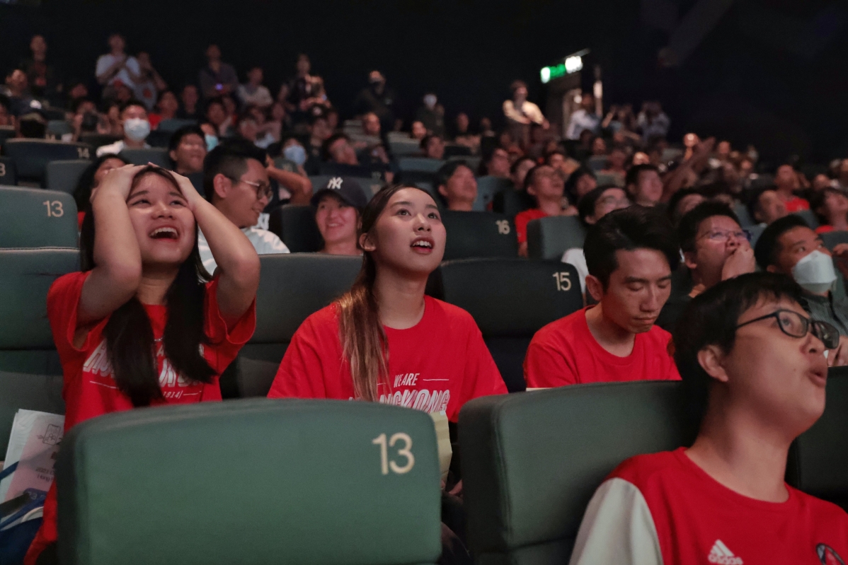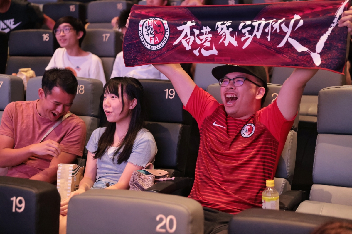 (香港中通社記者洪少葵攝) 今晚港足首次出戰亞運半決賽,香港有多重視這場比賽? 其中,香港足球總會晚上在銅鑼灣一間戲院包場,請市民一同觀賞賽事,全院滿座! 開場前一小時,已經有大批市民在戲院外等候,部分人身穿港隊球衣,有人甚至身披區旗到場。伍先生表示,自己一下班立馬趕來觀賽。自己已經支持港隊30年以上,儘管日本勝算較大,但仍希望港隊“關關難過關關過”。而另一位身穿港隊球衣的方同學就表示,港足能走到這一步已經很不容易,認為每一場表現都有驚喜。
