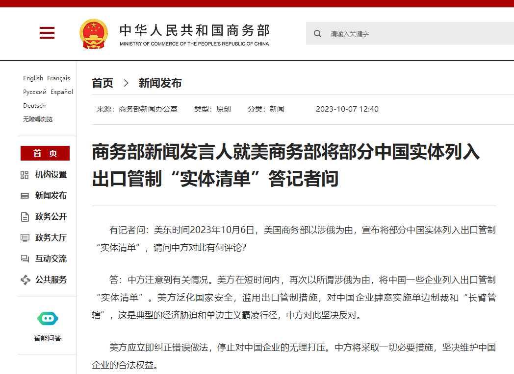 網站截圖 有記者問:美東時間2023年10月6日,美國商務部以涉俄為由,宣佈將部分中國實體列入出口管制“實體清單”,請問中方對此有何評論? 商務部新聞發言人表示,中方註意到有關情況。美方在短時間內,再次以所謂涉俄為由,將中國一些企業列入出口管制“實體清單”。美方泛化國家安全,濫用出口管制措施,對中國企業肆意實施單邊制裁和“長臂管轄”,這是典型的經濟脅迫和單邊主義霸淩行徑,中方對此堅決反對。 美方應立即糾正錯誤做法,停止對中國企業的無理打壓。中方將採取一切必要措施,堅決維護中國企業的合法權益。 【編輯:丘志彬】