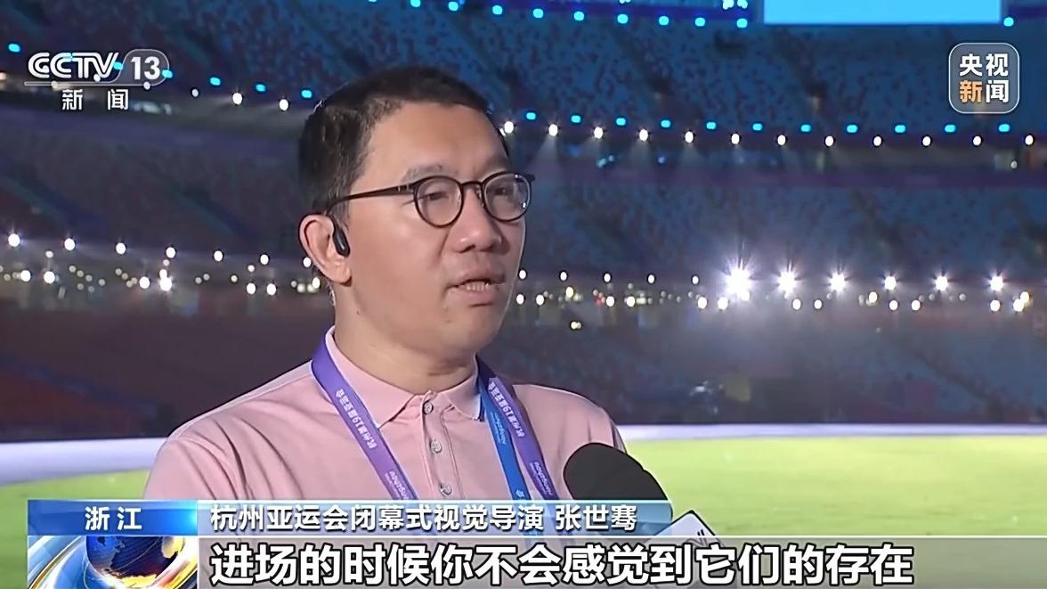 杭州亞運會閉幕式視覺導演 張世騫:我們在草坪裡面藏了4萬多個LED燈珠,進場的時候你不會感覺到它們的存在,但是隨著音樂,隨著節目,隨著情緒表達,視覺呈現,它們會亮起來,然後讓觀眾感覺到從一個正常的比賽的場景幻化出來我們想要的浪潮、荷花和桂花這些圖案。