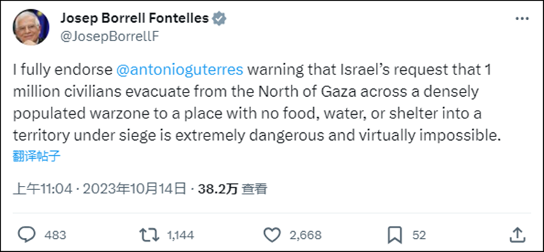 博雷利在社交媒體X平台(原推特平台)就巴以局勢發文 值得注意的是,這是博雷利連日來第二度敦促以色列遵守國際人道法。10月10日,博雷利也曾表示,以色列有權對巴勒斯坦伊斯蘭抵抗運動(哈馬斯)的襲擊做出自衛行為,但其反應必須符合國際人道法,譴責以色列對加沙地帶實施斷水斷電斷糧的“全面封鎖”行為違反了國際法。 據路透社、半島電視台等外媒報道,聯合國秘書長髮言人當地時間10月12日深夜表示,以方通知聯合國,要求加沙地帶北部約110萬平民向南撤離,限期24小時。該發言人稱,這種人口遷移行動“是不可能的”,并提醒將造成毀滅性人道主義後果。 數小時後,以色列軍方發佈正式聲明:“以色列國防軍要求加沙城的所有平民為了他們自身安全,從他們的家中向南撤離,搬到加沙河(Wadi Gaza)以南地區。” 加沙是位於以色列和埃及之間的一片狹長地帶,目前有230萬巴勒斯坦人居住。自哈馬斯2007年6月通過武力從巴勒斯坦民族解放運動(法塔赫)手中奪取加沙地帶控制權後,以色列封鎖加沙地帶,把那里變成“世界最大的露天監獄”。 自哈馬斯突襲以色列次日(10月8日),以色列軍隊對加沙地帶展開大規模轟炸和全面封鎖。同時以色列官員頻繁放話,表示將對加沙地帶“發動地面攻勢”。目前,以色列已在加沙地帶附近集結了超30萬名預備役軍人。