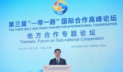 香港中通社圖片 今年是共建“一帶一路”倡議十周年。李家超表示,在習主席的親自謀劃、親自部署、親自推動下,這項重大倡議促進了國際間互聯互通、合作共贏,現已成為構建人類命運共同體的重大實踐平台。 他說,第三屆“一帶一路”國際合作高峰論壇為國家今年的重點主場盛事,亦是推動共建“一帶一路”倡議最高級別的國際活動。很榮幸率領高規格的70人香港特別行政區代表團積極參與高峰論壇。我們期待向國際社會更好展示香港各方面的優勢,充分顯示香港全面助力國家共建“一帶一路”工作。