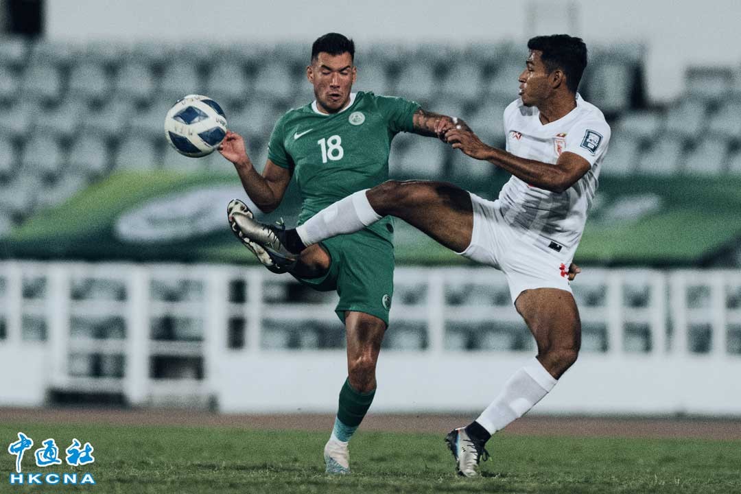 10月17日,在澳門2026世界盃亞洲區外圍賽預選第一圈比賽中,中國澳門(綠衣)0比0逼和緬甸。香港中通社圖片