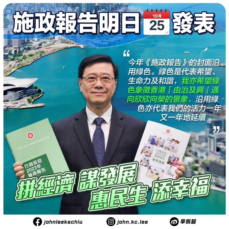 香港新聞網10月24日電 香港特區行政長官李家超將於明日(10月25日)發表任內第二份《施政報告》。李家超今早(24日)出席行會前見記者,指今年《施政報告》的主題是“拼經濟、謀發展、惠民生、添幸福”。其封面亦會繼續沿用綠色,除了代表希望,生命力及和諧外,亦象徵香港由治及興,欣欣向榮,活力一年又一年延續。
