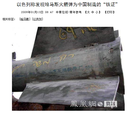 為利用巴以衝突抹黑大陸,有台媒用了一張14年前的老照片!香港新聞網10月26日電 “中國軍援被抓到!”巴以衝突持續之際,台灣一家“綠媒”突然援引網絡消息,興奮炒作“巴勒斯坦伊斯蘭抵抗運動(哈馬斯)射向以色列的火箭彈與中國大陸有關”,並刊出一張寫著簡體中文“山東萊陽鋼管廠”七個大字的哈馬斯火箭彈圖片,企圖攻擊抹黑大陸。但事實上,這就是一張舊圖,“萊陽鋼管廠”也早已對此進行過闢謠,強調產品只是民用鋼管。