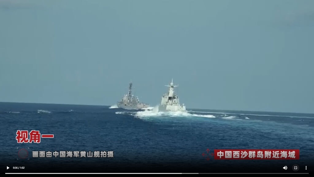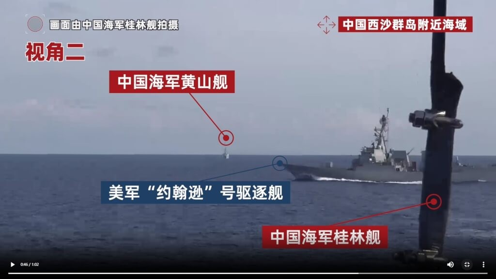 中國軍方發佈美軍艦強行穿越中方艦艇編隊視頻證據。圖源:中國國防部網頁 該段時長1分2秒的視頻片段顯示,美軍約翰遜號驅逐艦今年8月19日在西沙群島附近海域,近距離滋擾正常訓練的中國海軍艦艇編隊,期間美方軍艦多次大角度轉向,急加減速及橫穿中方艦艏挑釁,危險接近中國海軍艦艇,最近距離3.6鏈,約670公尺。違反《國際海上避碰規則》等,危及雙方人員和艦艇安全。 國防部新聞發言人吳謙表示,類似視頻中方還有很多,強調中美艦機近距離接觸的地點均是中國周邊海空域,批評美方想一邊危害中國國家安全,一邊不受約束地挑釁滋擾,是不可能完成的任務。他指出,中國軍隊始終保持高度戒備,堅決捍衛國家主權安全和海洋權益。 (完) 【編輯:王軼南】