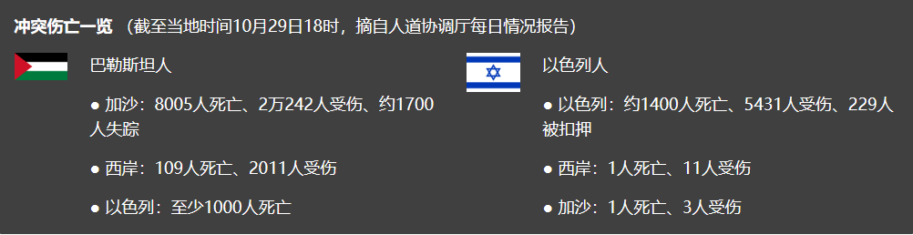 巴以衝突 | 加沙千人搶物資 人道系統面臨崩潰香港新聞網10月30日電 據聯合國29日發布消息,有數千人闖入聯合國近東難民救濟工程處位於加沙地帶中部和南部的幾個倉庫和配送中心,搶走了麵粉和衛生用品等其他基本生存物品。其中,位於代爾巴拉赫的一個倉庫存放著來自埃及的人道主義車隊運來的物資。聯合國擔憂,民事秩序混亂,人道系統正面臨崩潰。 巴以衝突不斷升級,在平民死亡人數也不斷攀升的情況下,聯合國人權事務高級專員蒂爾克不斷發出呼籲,要求結束巴以衝突並釋放所有人質。 日前聯合國人權事務高級專員辦事處發言人沙姆達薩尼(Ravina Shamdasani)在日內瓦表示,當地的工作人員每晚都要權衡睡在戶外還是室內,以免被掉落的天花板或彈片砸死。有報道稱,父母在孩子的手臂上寫下他們的名字,以便能够辨認他們的遺體。這些新聞令人痛心不已。