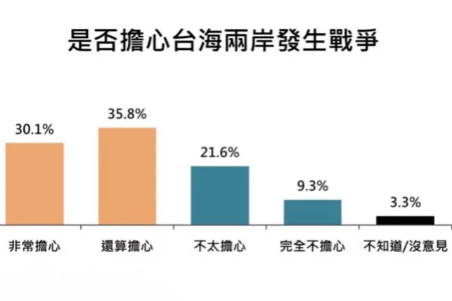 根據台灣ETtoday新聞雲公布的最新民調顯示,有65.9%的台灣民眾擔心兩岸發生戰爭,並有63.9%的受訪民眾認為“2024年台灣地區領導人選舉是戰爭與和平的選擇”,更有54%的受訪者認為民進黨2024年台灣地區領導人選舉參選人賴清德若當選會使兩岸關係更加緊張。