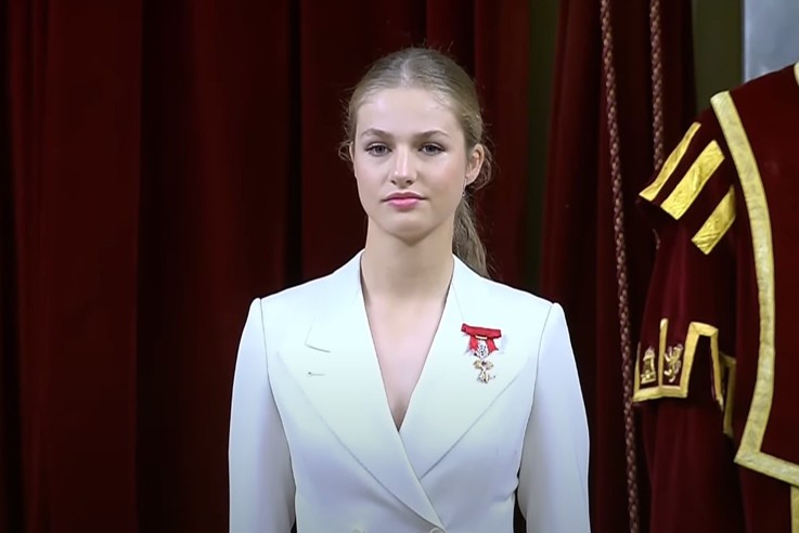 西班牙王儲萊昂諾爾公主。視頻截圖 萊昂諾爾當日在其父親、國王費利佩六世(King Felipe VI),母親雷蒂西亞(Queen Letizia)王后和妹妹索菲婭(Sofia)陪伴下,搭乘勞斯萊斯前往馬德里的議會,參加這場盛大的典禮。 萊昂諾爾在眾議院議長阿門戈爾監誓下,宣誓忠誠履行職責,維護堅守憲法及法律,尊重公民及地區的權利,並效忠國王。 按照西班牙憲法,王儲在成年時要向憲法宣誓,作為繼承王位的一部分。萊昂諾爾的誓詞跟父親費利佩六世在1986年滿18歲時宣誓的內容相同,“忠實履行職責,遵守並維護憲法和法律,尊重公民和自治區的權利,效忠國王”。 萊昂諾爾隨後在王宮接受父王授予勳章,並表示從今開始,每一刻都會為所有西班牙人服務。 萊昂諾爾在2014年6月19日成為阿斯圖里亞斯女親王(Princess of Asturias),今年5月從英國威爾斯UWC大西洋學院(UWC Atlantic College)畢業,現在正在薩拉戈沙(Zaragoza)軍校接受三年的軍事訓練,為未來擔任國家元首做準備。(完) 【編輯:梅婉潼】