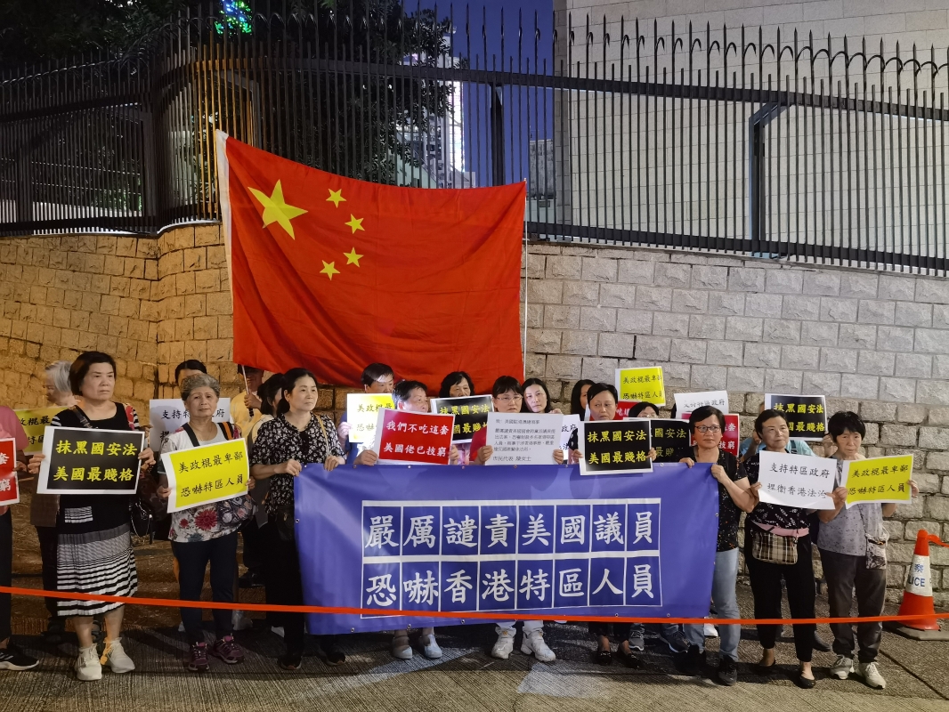 香港新聞網11月5日電11月5日,多批市民到美國駐港總領事館,強烈譴責美國國會跨黨派議員提出法案、恐嚇制裁49名香港特區官員。香港立法會議員亦到場,譴責美國政客踐踏香港法治的行為。