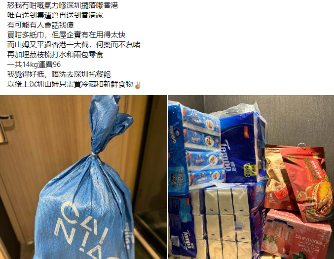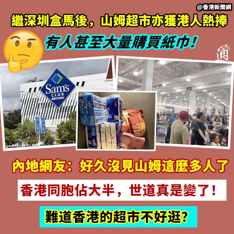 (小紅書截圖) 帖文發出後,引發數百網友留言討論。 內地網友紛紛附和:“他們都一人拖一個行李箱逛山姆”,“前海山姆,很多香港人拖家帶口,帶著行李箱的......” 坐標香港的網友則解釋:“香港超市沒那麼多東西買(賣),而且香港人覺得山姆便宜且份量大”。 山姆超市是美國的一家會員制倉儲式超市,是沃爾瑪公司旗下的子公司。目前在深圳有4家分店,以會員制度營運,消費者需至少支付人民幣260元(約港幣280元)作為年費,才能進入超市掃貨。其貨品五花八門,涵蓋生活用品、電器、食品等。當中,第4家分店、深圳前海店佔地達到3萬平方米。 目前,香港還無同類型的超市,料因此吸引大批港人北上“朝聖”。 翻查社交平台臉書的“山姆會員商店”香港人群組,可見成員已達5.8萬人。此外,多個圍繞北上吃喝玩樂的社交賬號,亦不時見到港人曬出逛山姆後的“戰利品”,除食物外,就連紙巾都在深圳買! 有香港網友上傳購物照片,顯示除食品外,還有大堆紙巾。該網友解釋,家裡紙巾用得太快,亟需補貨,“而山姆(紙巾價格)比香港便宜一大截,何樂而不為。”