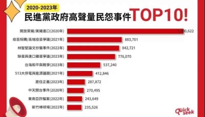 台灣民眾對民進黨“十大民怨”曝光:“缺蛋”排名第一分享到: