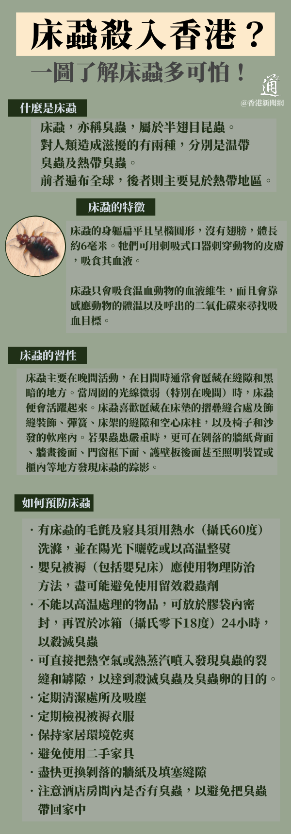 香港新聞網11月10日電 近日網上流傳一張照片,疑在香港機場快綫列車上發現床蝨(亦稱臭蟲),引起全城關注,不少人擔心香港亦會爆發床蝨危機。到底什麼是床蝨?又如何預防呢?一圖給你科普為什麼引起市民憂慮,請戳圖↓↓