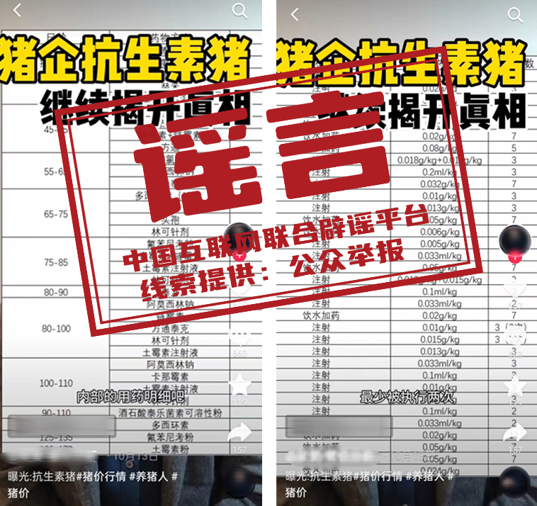 香港新聞網11月12日電 近日,有內地網友在某視頻類社交平台發布視頻稱,“某生豬養殖企業140天飼養周期內用34種抗生素”,引發網絡關注。對此,中國互聯網聯合闢謠平台向有關主管部門核實查證,證實視頻中宣稱的“生豬養殖環節濫用抗生素”等信息為虛假信息。