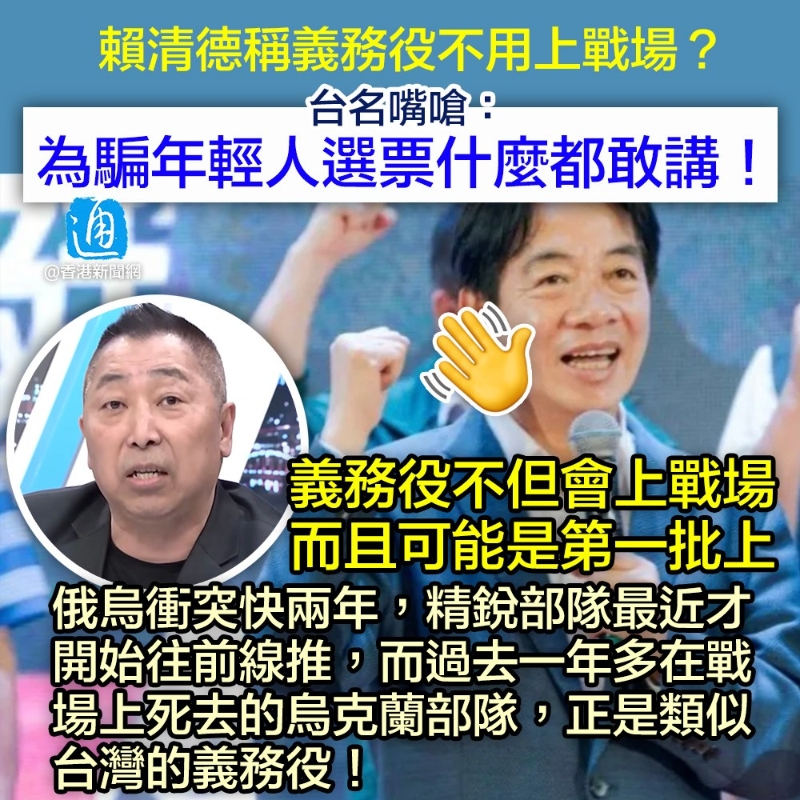 賴清德稱義務役不用上戰場?台名嘴嗆:為騙選票什麼都敢講!分享到: