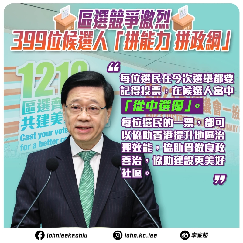 李家超FB圖片 他指出,今次選舉所有地方選區以及地區委員會的界別選舉競爭熱烈。在地方選區選舉,每區平均近4名的候選人競爭2個席位,而地區委員會界別選舉方面,228人會競爭18區共176個席位,強調每位候選人都要拼能力、拼政綱,以提升地區治理效能,令香港良政善治。 李家超呼籲每名選民屆時投票,從中選優,選出最適合、有心、有能力、愛國愛港的區議員服務社區。而為了便利身在內地的選民回香港投票,港鐵上水站附近有兩間學校將會設立鄰近邊境投票站。 香港2023年區議會一般選舉將於今年12月10日舉行,以選出176名地區委員會界別議員及88名區議會地方選區議員。18個地區委員會界別和44個區議會地方選區的選舉主任於提名期內共接獲399份提名表格。區議會資格審查委員會已完成審查399名候選人的提名,認為全部候選人符合擁護基本法和效忠香港特區的法定要求和條件,並裁定他們的提名為有效。 新一屆區議會將於明年1月1日履職。本次選舉是香港特區重塑區議會、完善地區治理體系後第一場全港性大型選舉,意義重大。(完) 【編輯:孟宜君】