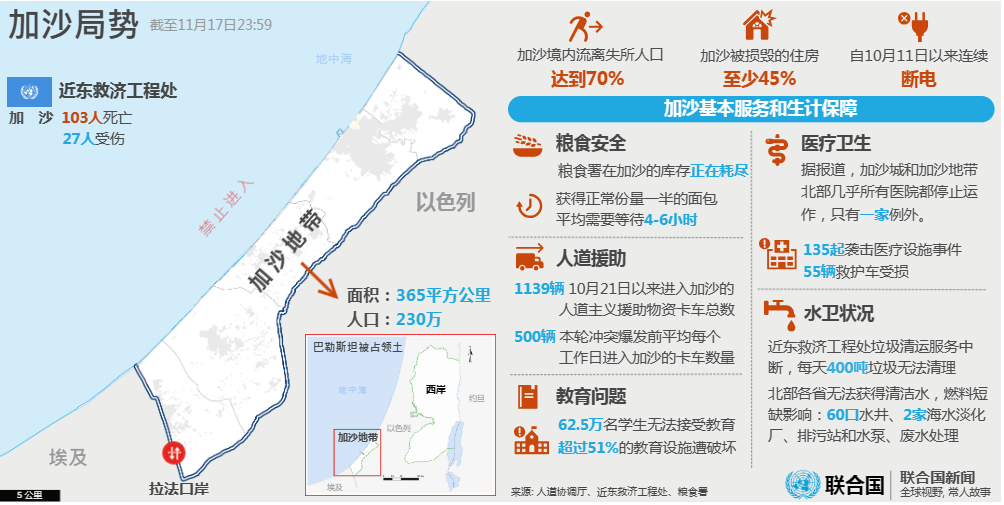 圖源:聯合國新聞網 聯合國人道主義事務協調廳在周四晚間發佈最新簡報稱,過去24小時,加沙發生了猛烈的空襲、炮擊和戰鬥。目前仍有超過80萬巴勒斯坦人留在加沙北部,約占本輪衝突昇級前當地人口的三分之二,另外三分之一的人口(約40萬人)很可能已經逃往南部地區。留在北部的“成千上萬人”目前都在學校、醫院等公共設施以及寄宿家庭避難。 聯合國近東巴勒斯坦難民救濟和工程處報告稱,由於電信公司發電機運行所需的燃料耗盡,本周四加沙出現了通訊中斷問題。近東救濟工程處指出,通訊中斷可能會擾亂周五人道主義援助車隊的協調工作。 緊急救濟協調員表示,情況可能會更糟。 據巴勒斯坦伊斯蘭抵抗運動(哈馬斯)媒體辦公室17日發表聲明說,新一輪巴以衝突爆發以來,以色列軍隊對加沙地帶的襲擊已造成超過1.2萬人死亡、3萬餘人受傷。聲明說,死者中有5000多名兒童和3300多名婦女,另有約3750人失蹤。 以色列國家安全顧問哈內格比17日確認,以色列戰時內閣16日晚同意了美國向以色列提出的“特別要求”,允許每天有兩卡車的燃料進入加沙地帶,以運行加沙地帶瀕臨崩潰的污水處理系統。 糧食儲備幾乎耗盡 聯合國人權事務高級專員蒂爾克(Volker Türk)表示,如果戰火繼續下去,危機蔓延到中東更廣泛地區的風險將越來越大,他對此深表擔憂。蒂爾克還強調,這場危機對多邊體系造成了又一次全球性的衝擊,“加劇了兩極分化,造成了更深的裂痕,對人類迫切需要的解決方案產生了可怕的影響”。