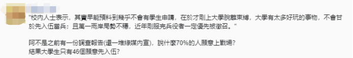 還有網民表示,“不是之前有一份調查報告(還一堆綠媒),說什麼70%的人願意上戰場?結果大學生只有46個願意先入伍?”↓