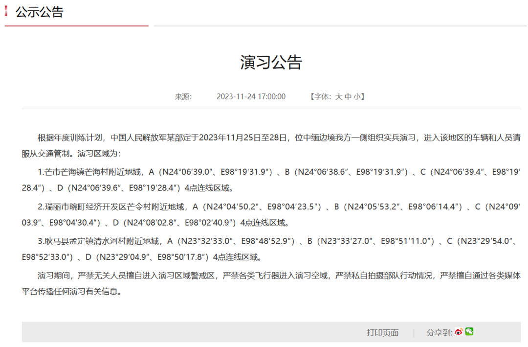 中國宣布:中緬邊境區域將進行4天實兵演習香港新聞網11月26日電 中國雲南省人民政府網站消息,根據年度訓練計劃,中國人民解放軍某部定於2023年11月25日至28日,位中緬邊境中方一側組織實兵演習,進入該地區的車輛和人員請服從交通管制。演習區域為: 1.芒市芒海鎮芒海村附近地域,A(N24°06′39.0″、E98°19′31.9″)、B(N24°06′38.6″、E98°19′31.9″)、C(N24°06′39.4″、E98°19′28.4″)、D(N24°06′39.6″、E98°19′28.4″)4點連線區域。 2.瑞麗市畹町經濟開發區芒令村附近地域,A(N24°04′50.2″、E98°04′23.5″)、B(N24°05′53.2″、E98°06′14.4″)、C(N24°09′03.9″、E98°04′30.4″)、D(N24°08′02.8″、E98°02′40.9″)4點連線區域。 3.耿馬縣孟定鎮清水河村附近地域,A(N23°32′33.0″、E98°48′52.9″)、B(N23°33′27.0″、E98°51′11.0″)、C(N23°29′54.0″、E98°52′33.0″)、D(N23°29′04.9″、E98°50′17.8″)4點連線區域。 演習期間,嚴禁無關人員擅自進入演習區域警戒區,嚴禁各類飛行器進入演習空域,嚴禁私自拍攝部隊行動情況,嚴禁擅自通過各類媒體平台傳播任何演習有關信息。(完)