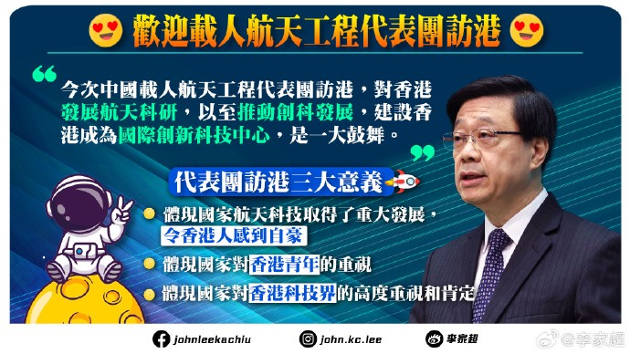(圖源:李家超微博) 他相信,此次中國載人航天工程代表團訪港,對香港發展航天科研、推動創科發展,以及建設香港成為國際創新科技中心,都是一大鼓舞。 此外,中國第四批航天員選拔在2022年啟動,首次在港澳地區選拔載荷專家。李家超亦說,期待首位“港產航天員”的誕生。
