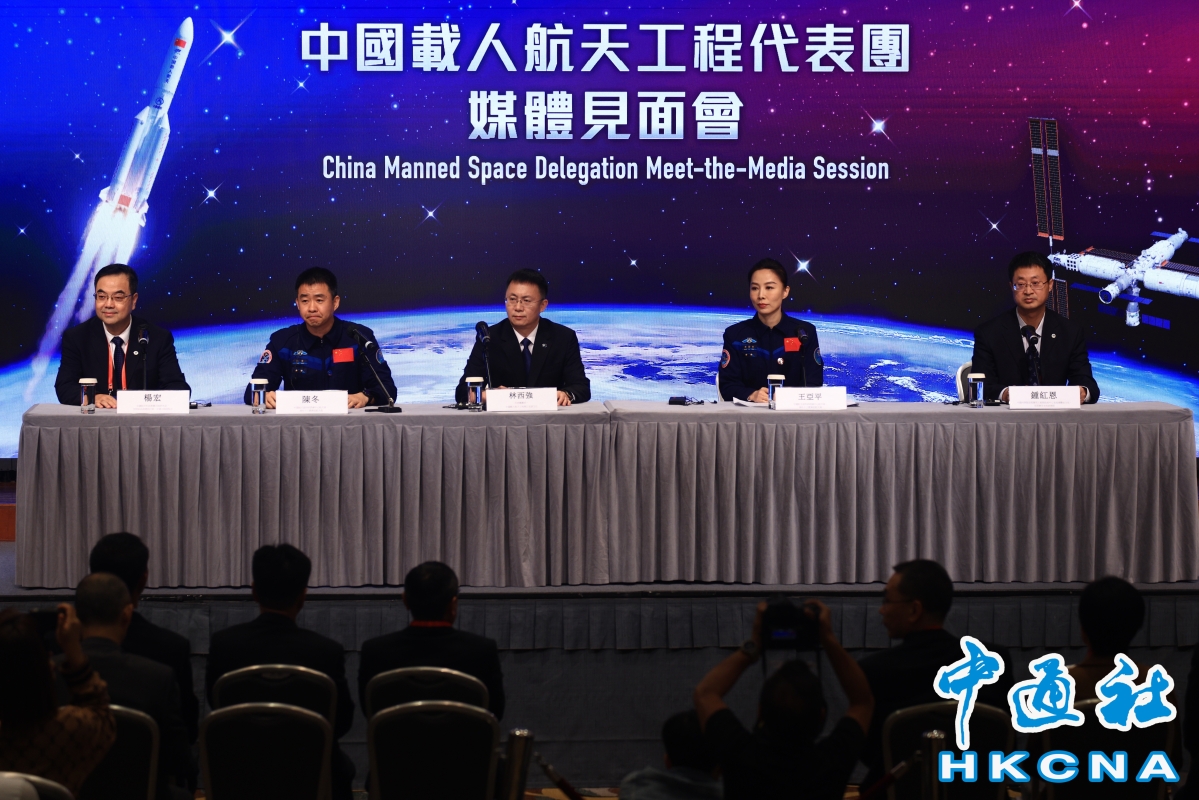 小學生們在接機大堂揮動國旗及區旗歡迎代表團來訪。(香港中通社記者 謝光磊 攝) 當天下午的媒體見面會,4名航天員換上一身深藍色航天員秋冬常服,與其他成員一同亮相。身兼團長的林西強表示,代表團今次是應香港和澳門特別行政區政府的邀請,來向港澳同胞報告國家載人航天工程的最新進展,分享中國太空站圓滿完成建造的喜悅,冀推動港澳地區更多人參與載人航天事業。 他指出,國家自1992年起以三步走發展策略,由神舟5號首次實現中華民族飛天夢想之後,天宮1號、天宮2號等飛行任務突破了關鍵技術,以及其後12次載人、載物的飛行任務,圓滿實現了三步走發展策略目標。他又說,今年載人登月任務已得到中央政府正式批准立項,目標是在2030年前實現中國人首次登月,開展月球科學考察及相關技術試驗,突破掌握載人地月往返、月面短期駐留及人機聯合探測等關鍵技術,現時載人航天辦公室已全面部署準備工作,包括研製新一代載人運載火箭、新一代載人飛船及月面着陸器等。