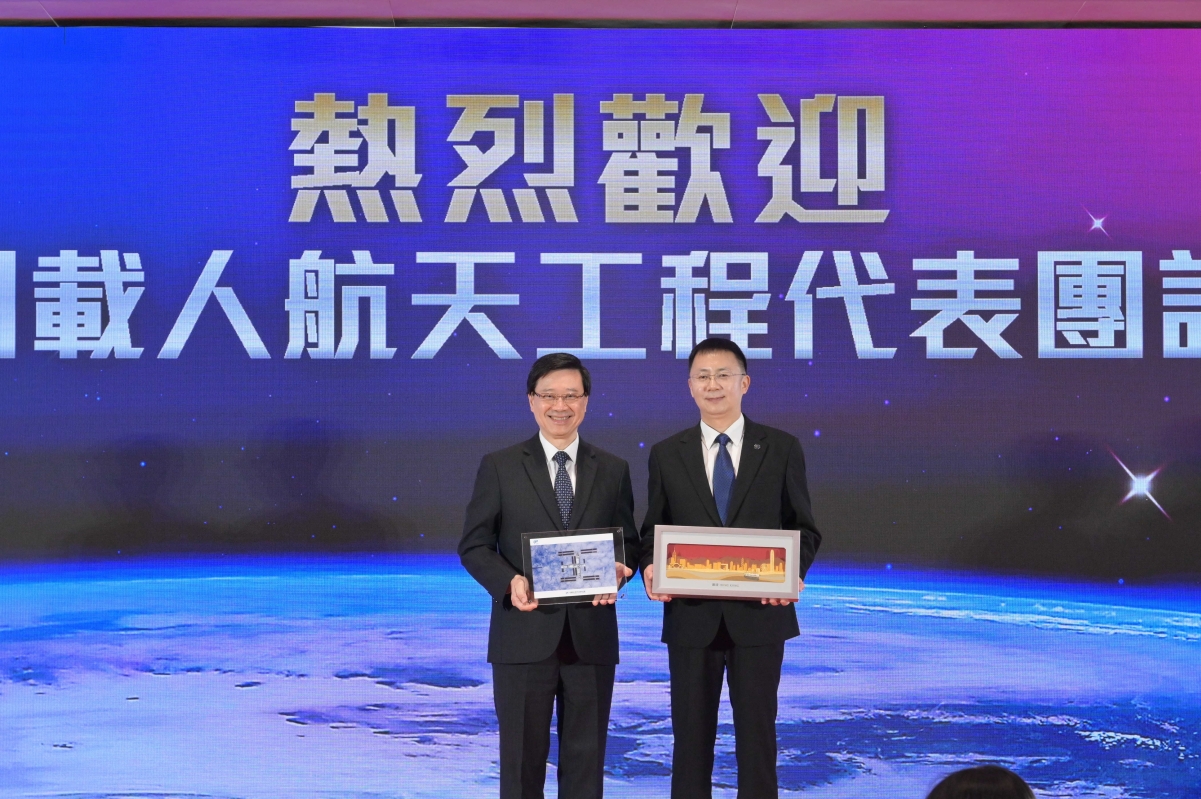 李家超(左四)和林西強(右四)與其他代表團成員主持祝酒儀式。香港特區政府新聞處圖片 李家超指出,國家航天科技發展,一日千里。從1992年決策開展載人航天工程,到2003年中國航天員搭乘“神舟五號”首次進入太空;從掌握太空交會對接技術,到去年全面建成中國空間站,中國載人航天工程在超過30年以來作出一項又一項突破,向全世界展示如何以“中國速度”,朝着航天夢進發。他形容“你們所創下的成就,讓作為中華兒女的我們,都感到份外驕傲和自豪”。 他說,多年來,香港的大學科研團隊一直積極參與國家航天任務。其中,香港理工大學團隊,就多次為“嫦娥探月”任務研發太空儀器,更參與“天問一號”火星探測任務。香港中文大學的研究項目在今年,隨“天舟六號”和“神舟十六號”飛船升空,在中國空間站進行實驗。去年,國家首次在香港選拔載荷專家,香港的候選人更成功進入定選,也就是選拔的最後階段。這次選拔工作,代表國家對香港科技界的高度重視和肯定,讓香港市民深感鼓舞,更期待香港候選人有機會參與國家載人航天工程,“達到像你們一樣的高度,為實現國家航天夢作出貢獻”。