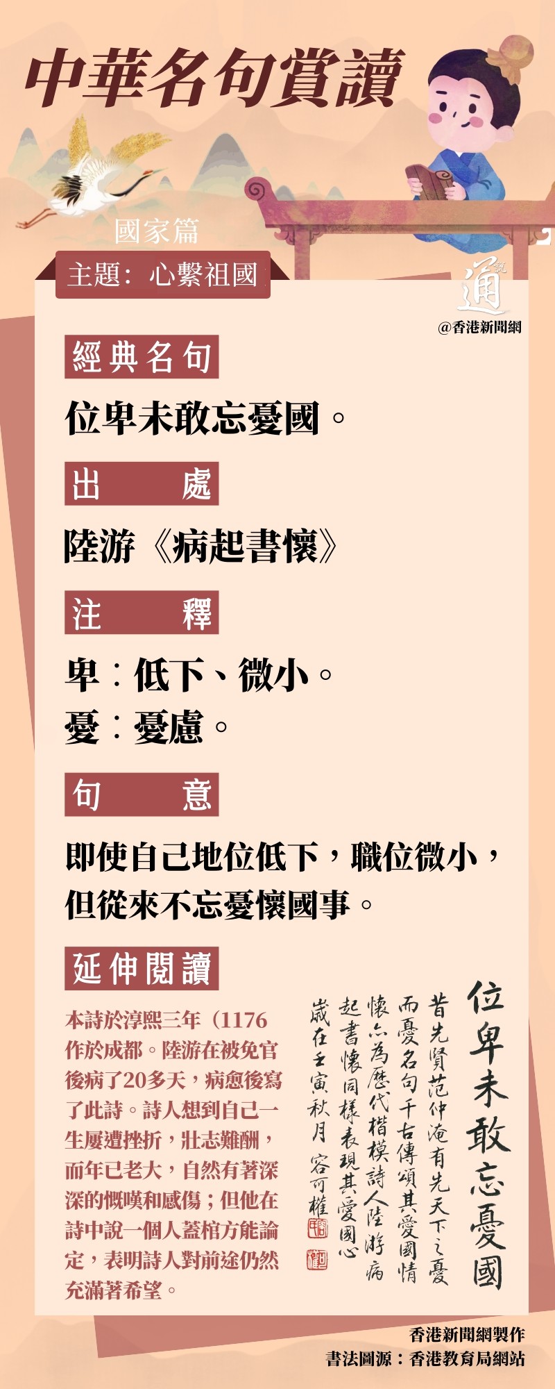 香港新聞網12月4日電  為加強中國文學和文言經典的學習,香港特區政府教育局繼續開展“中華經典名句推廣活動”,從《致知達德》(中華傳統美德語文學習資源)中選取40則名句,作為本學年推廣的內容。香港新聞網由此策劃“中華名句賞讀”系列。