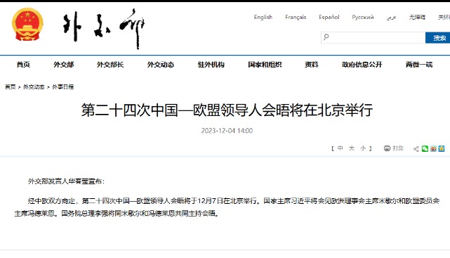 香港中通社12月5日電(記者 黎金良)經中歐雙方商定,第二十四次中國—歐盟領導人會晤將於12月7日在北京舉行。據中國官方公布,中國國家主席習近平將會見歐洲理事會主席米歇爾和歐盟委員會主席馮德萊恩。中國國務院總理李強將同米歇爾和馮德萊恩共同主持會晤。