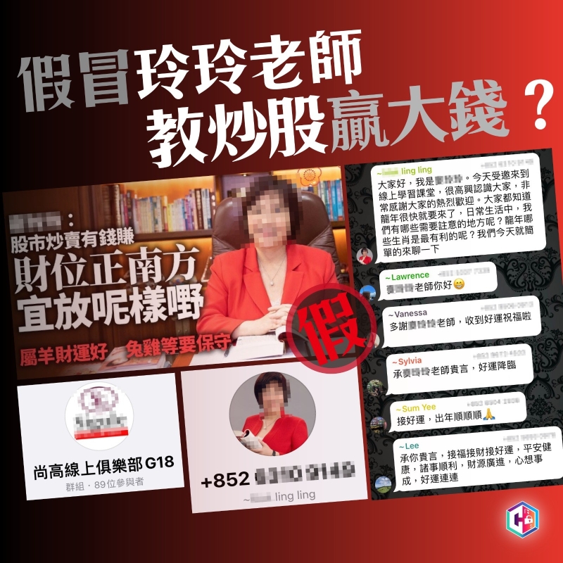 警方昨日在社交媒體專頁“守網者”發布這個數字時,還透露這些投資騙案中,6成案件涉及加密資產,其餘涉及內地和香港股票。 大家可能很好奇,騙徒用的是什麼手法? 根據警方提到的個案,早前在一個名為“尚高線上俱樂部 G18”的WhatsApp投資群組內,驚見有騙徒假冒名人,現身發放投資提醒招搖撞騙。 從警方發放的圖片可見,騙徒用香港名人麥玲玲的相片作為頭像,在群組內聲稱“受邀來到線上學習課堂”,不少群組成員隨即留言回覆。