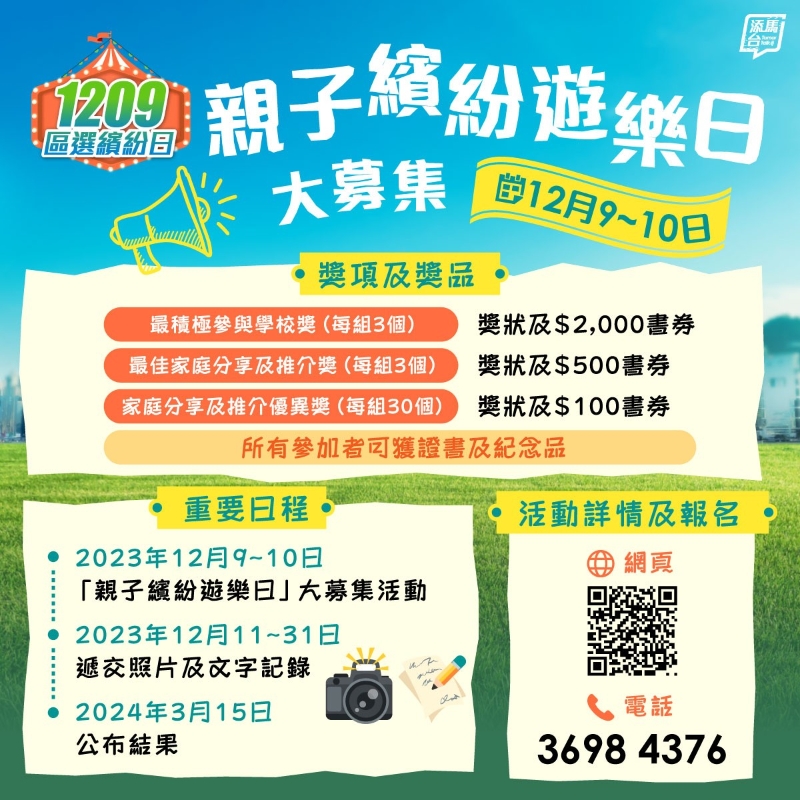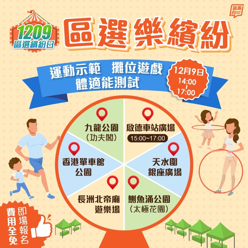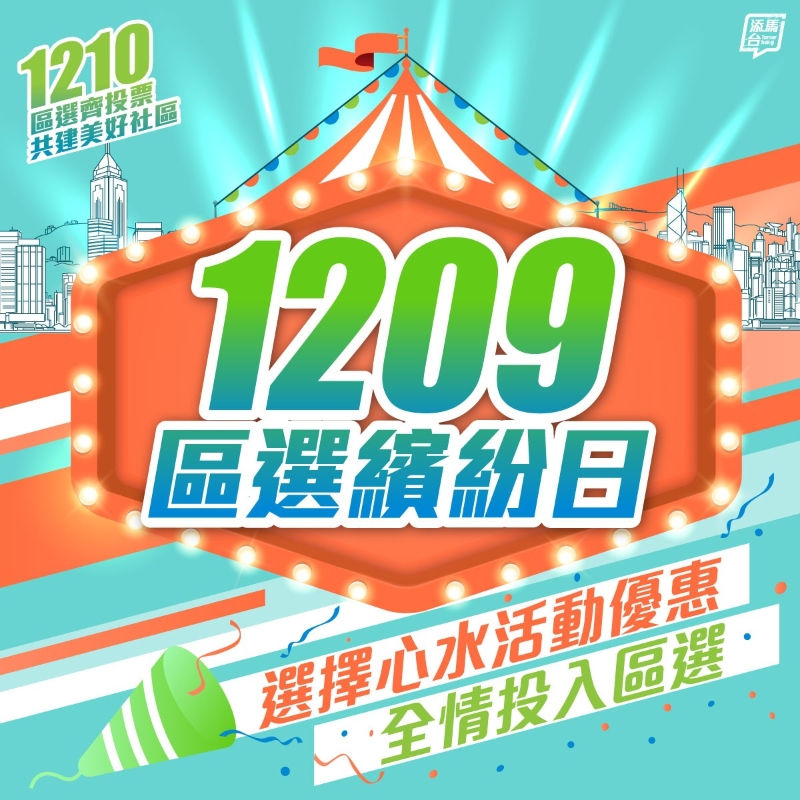 今日“區選繽紛日”的活動和優惠十分豐富,當中包括在全港多區舉行嘉年華活動。其中發展局及海濱事務委員會於灣仔海濱舉行 “一個聖誕‧一個維港”期間限定活動,活動時間為下午2時至6時。香港藝土民間於觀塘海濱舉行三項達人拉機挑戰賽2023,活動時間為上午9時至下午6時。康樂及文化事務署會在6個室外場地舉辦加入運動元素及遊戲等的區選樂繽紛嘉年華活動,地點分別是九龍公園(功夫閣)、啟德車站廣場、香港單車館公園、天水圍銀座廣場、長洲北帝廟遊樂場及鰂魚涌公園(太極花園)。除啟德車站廣場活動是於下午3時至5時進行外,其餘5個場地的活動時間均為下午2時至5時。
